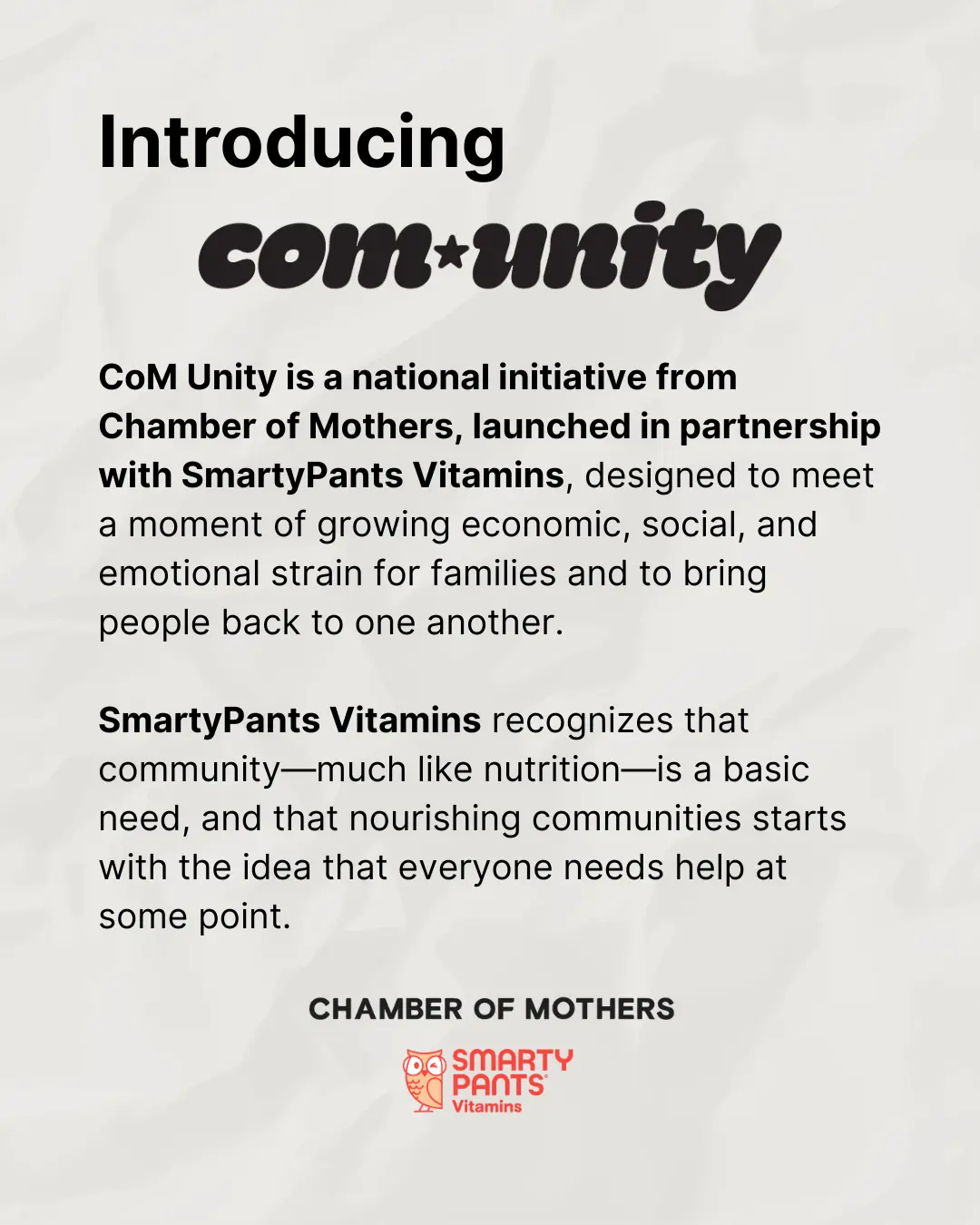 CoM Unity is a national initiative from Chamber of Mothers, launched in partnership with SmartyPants Vitamins, designed to meet a moment of growing economic, social, and emotional strain for families and to bring people back to one another.
