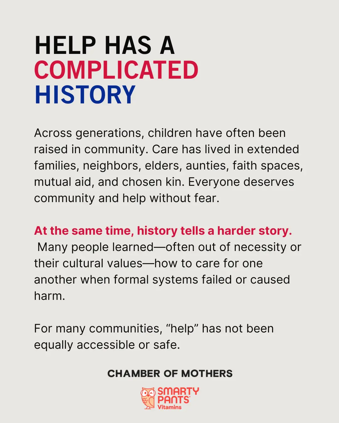 Across generations, children have often been raised in community. Care has lived in extended families, neighbors, elders, aunties, faith spaces, mutual aid, and chosen kin. Everyone deserves community and help without fear.